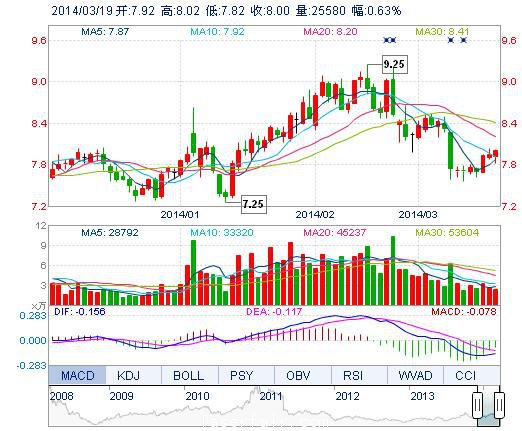 今開: 7.92 成交量: 2.56萬手 振幅: 2.52% 最高: 8.02 成交額: 2026.99萬元 換手率: 0.93% 最低: 7.82 總市值: 22.80億 市凈率: 3.66 昨收: 7.95 流通市值: ...