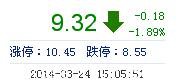 今開: 9.45 成交量: 16.93萬手 振幅: 3.16% 最高: 9.48 成交額: 1.58億元 換手率: 1.90% 最低: 9.18 總市值: 83.05億 市凈率: 3.13 昨收: 9.50 流通市值: 83...