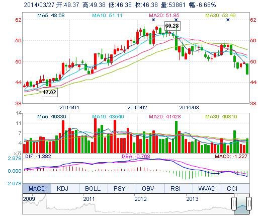 今開: 49.37 成交量: 5.39萬手 振幅: 6.04% 最高: 49.38 成交額: 2.57億元 換手率: 1.88% 最低: 46.38 總市值: 138.05億 市凈率: 9.09 昨收: 49.69 流通市值...