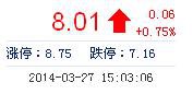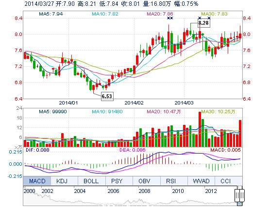 今開: 7.90 成交量: 16.80萬(wàn)手 振幅: 4.65% 最高: 8.21 成交額: 1.36億元 換手率: 3.85% 最低: 7.84 總市值: 34.99億 市凈率: 2.56 昨收: 7.95 流通市值: 34...