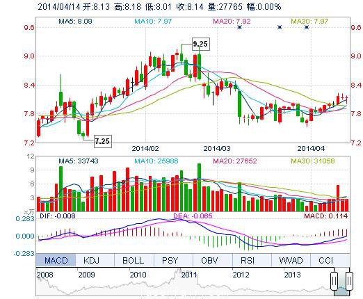 | 今 開(kāi): | 8.13 | 成交量: | 2.78萬(wàn)手 | 振 幅: | 2.09% |