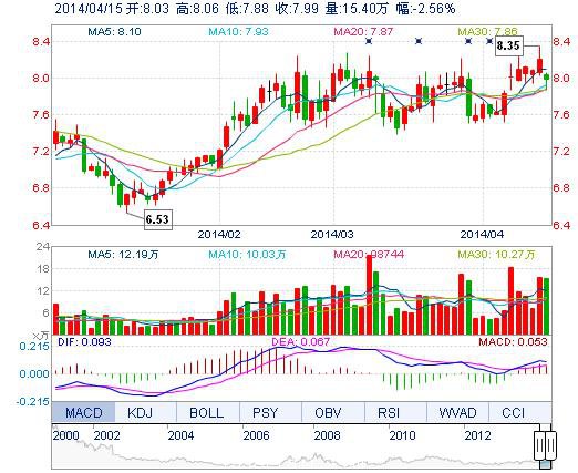 | 今 開: | 8.03 | 成交量: | 15.40萬手 | 振 幅: | 2.20% |
