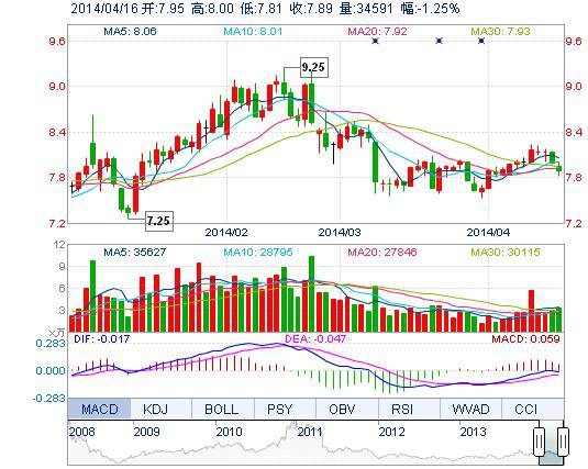 今開: 7.95 成交量: 3.46萬手 振幅: 2.38% 最高: 8.00 成交額: 2731.31萬元 換手率: 1.26% 最低: 7.81 總市值: 22.49億 市凈率: 3.61 昨收: 7.99 流通市值: ...
