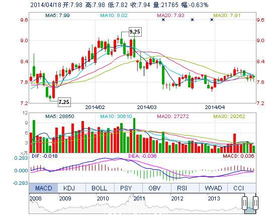 今開: 7.98 成交量: 2.18萬手 振幅: 2.00% 最高: 7.98 成交額: 1722.49萬元 換手率: 0.79% 最低: 7.82 總市值: 22.63億 市凈率: 3.63 昨收: 7.99 流通市值: ...