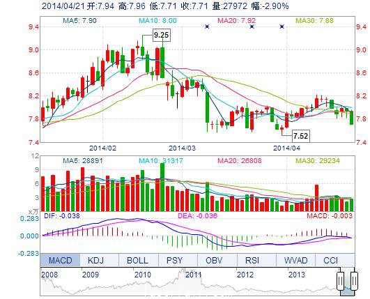 今開: 7.94 成交量: 2.80萬手 振幅: 3.15% 最高: 7.96 成交額: 2195.08萬元 換手率: 1.02% 最低: 7.71 總市值: 21.97億 市凈率: 3.52 昨收: 7.94 流通市值: ...