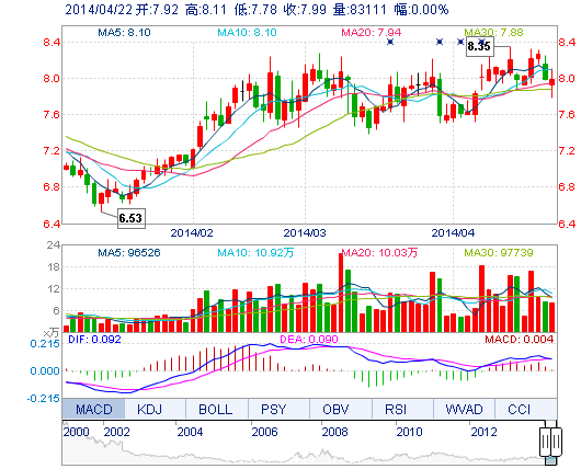 今開: 7.92 成交量: 8.31萬手 振幅: 4.13% 最高: 8.11 成交額: 6593.36萬元 換手率: 1.90% 最低: 7.78 總市值: 34.90億 市凈率: 2.55 昨收: 7.99 流通市值: ...