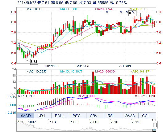 | 今 開: | 7.91 | 成交量: | 6.56萬手 | 振 幅: | 3.13% |