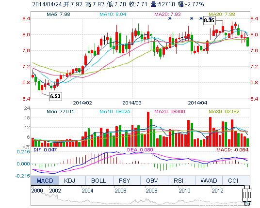 | 今 開: | 7.92 | 成交量: | 5.27萬手 | 振 幅: | 2.77% |