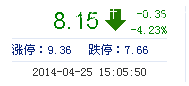 今開: 8.53 成交量: 19.96萬手 振幅: 5.88% 最高: 8.60 成交額: 1.65億元 換手率: 2.24% 最低: 8.10 總市值: 72.63億 市凈率: 2.71 昨收: 8.51 流通市值: 72...
