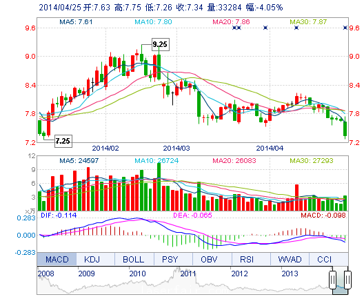 今開: 7.63 成交量: 3.33萬手 振幅: 6.41% 最高: 7.75 成交額: 2513.82萬元 換手率: 1.21% 最低: 7.26 總市值: 20.92億 市凈率: 3.35 昨收: 7.65 流通市值: ...
