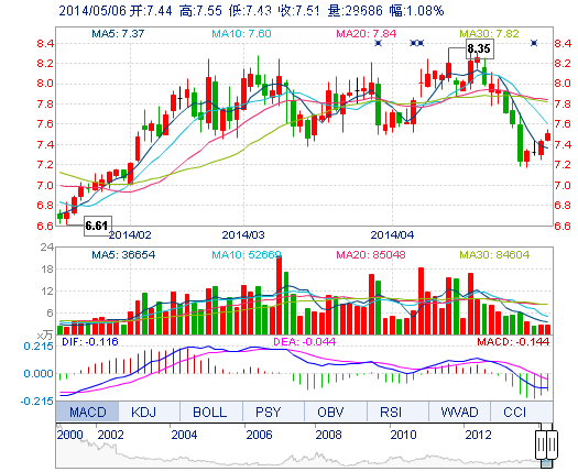 | 最 高: | 7.55 | 成交額: | 2151.75萬(wàn)元 | 換手率: | 0.66% |