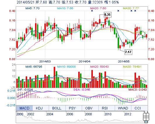 今開(kāi): 7.60 成交量: 3.23萬(wàn)手 振幅: 2.23% 最高: 7.70 成交額: 2462.68萬(wàn)元 換手率: 0.74% 最低: 7.53 總市值: 33.63億 市凈率: 2.41 昨收: 7.62 流通市值: ...