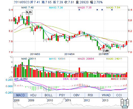 今開: 7.41 成交量: 2.89萬手 振幅: 3.51% 最高: 7.65 成交額: 2175.53萬元 換手率: 1.05% 最低: 7.39 總市值: 21.69億 市凈率: 3.38 昨收: 7.41 流通市值: ...
