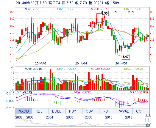 | 今 開: | 7.69 | 成交量: | 2.82萬手 | 振 幅: | 2.10% |