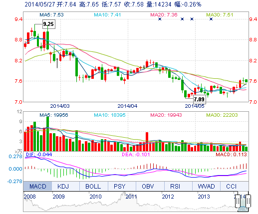 今開: 7.64 成交量: 1.42萬手 振幅: 1.05% 最高: 7.65 成交額: 1083.26萬元 換手率: 0.52% 最低: 7.57 總市值: 21.60億 市凈率: 3.37 昨收: 7.60 流通市值: ...