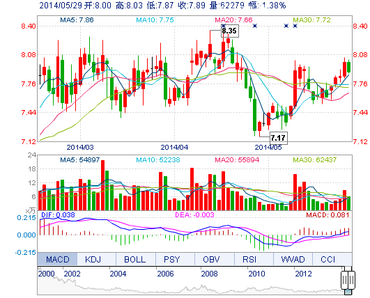今開: 8.00 成交量: 6.23萬手 振幅: 2.00% 最高: 8.03 成交額: 4937.95萬元 換手率: 1.43% 最低: 7.87 總市值: 34.46億 市凈率: 2.47 昨收: 8.00 流通市值: ...