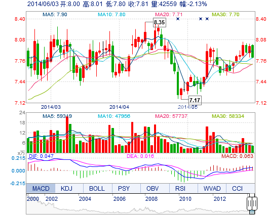 | 今 開: | 8.00 | 成交量: | 4.26萬手 | 振 幅: | 2.63% |