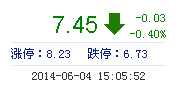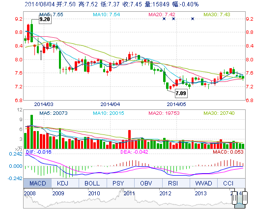 今開: 7.50 成交量: 1.58萬手 振幅: 2.01% 最高: 7.52 成交額: 1179.03萬元 換手率: 0.58% 最低: 7.37 總市值: 21.23億 市凈率: 3.31 昨收: 7.48 流通市值: ...