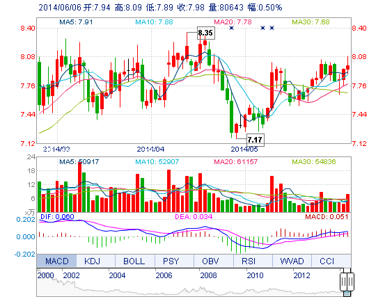 今開: 7.94 成交量: 8.06萬手 振幅: 2.52% 最高: 8.09 成交額: 6455.40萬元 換手率: 1.85% 最低: 7.89 總市值: 34.86億 市凈率: 2.50 昨收: 7.94 流通市值: ...