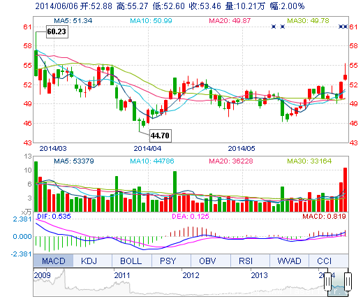 今開: 52.88 成交量: 10.21萬手 振幅: 5.09% 最高: 55.27 成交額: 5.51億元 換手率: 3.54% 最低: 52.60 總市值: 159.13億 市凈率: 9.58 昨收: 52.41 流通市值...