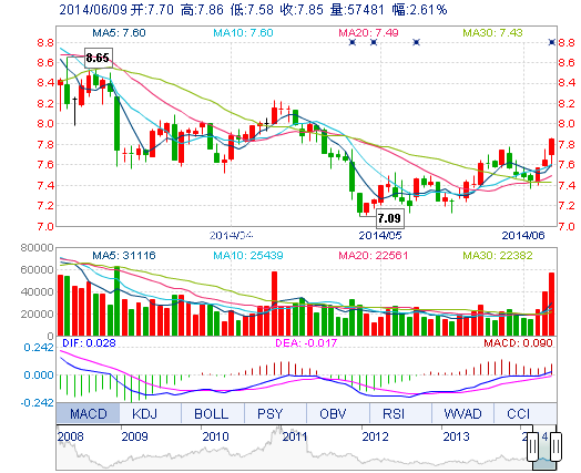 今開: 7.70 成交量: 5.75萬手 振幅: 3.66% 最高: 7.86 成交額: 4461.35萬元 換手率: 2.09% 最低: 7.58 總市值: 22.37億 市凈率: 3.49 昨收: 7.65 流通市值: ...