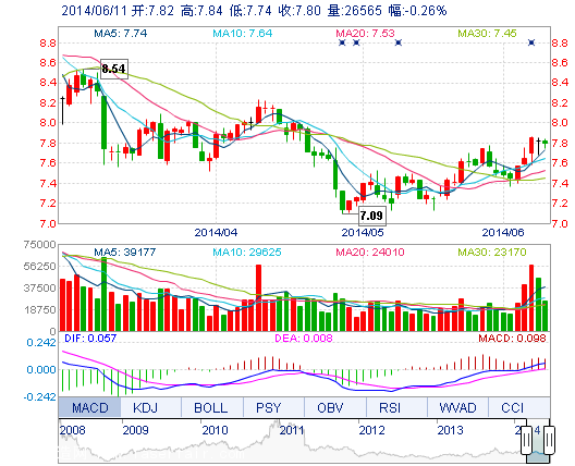 今開: 7.82 成交量: 2.66萬手 振幅: 1.28% 最高: 7.84 成交額: 2066.42萬元 換手率: 0.97% 最低: 7.74 總市值: 22.23億 市凈率: 3.46 昨收: 7.82 流通市值: ...