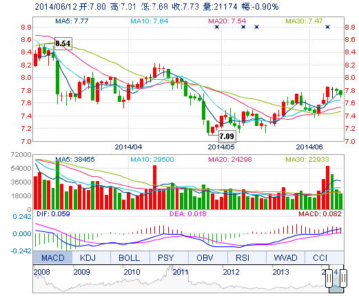 今開: 7.80 成交量: 2.12萬手 振幅: 1.67% 最高: 7.81 成交額: 1639.28萬元 換手率: 0.77% 最低: 7.68 總市值: 22.03億 市凈率: 3.43 昨收: 7.80 流通市值: ...