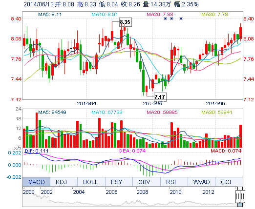 | 今 開: | 8.08 | 成交量: | 14.38萬手 | 振 幅: | 3.59% |
