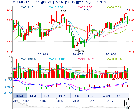 | 今 開: | 8.21 | 成交量: | 11.55萬手 | 振 幅: | 3.02% |