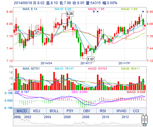| 今 開: | 8.02 | 成交量: | 5.43萬手 | 振 幅: | 1.49% |