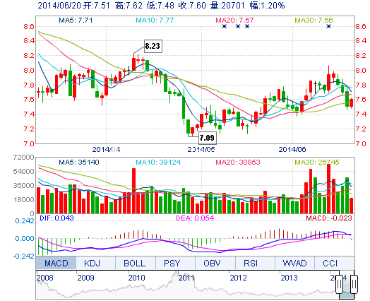 今開: 7.51 成交量: 2.07萬手 振幅: 1.86% 最高: 7.62 成交額: 1563.96萬元 換手率: 0.75% 最低: 7.48 總市值: 21.66億 市凈率: 3.38 昨收: 7.51 流通市值: ...