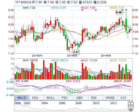 今開: 7.90 成交量: 4.75萬手 振幅: 1.14% 最高: 7.94 成交額: 3751.59萬元 換手率: 1.09% 最低: 7.85 總市值: 34.64億 市凈率: 2.49 昨收: 7.91 流通市值: ...