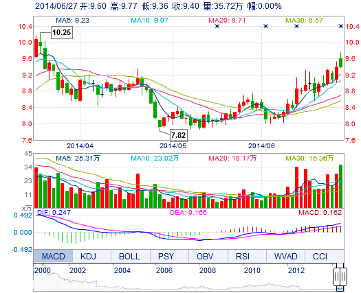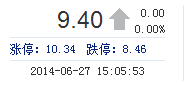 今開: 9.60 成交量: 35.72萬手 振幅: 4.36% 最高: 9.77 成交額: 3.41億元 換手率: 4.01% 最低: 9.36 總市值: 83.76億 市凈率: 3.13 昨收: 9.40 流通市值: 83...