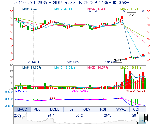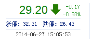 今開: 29.35 成交量: 17.35萬手 振幅: 2.66% 最高: 29.67 成交額: 5.07億元 換手率: 2.74% 最低: 28.89 總市值: 191.22億 市凈率: 5.23 昨收: 29.37 流通市值...