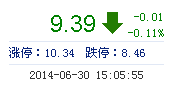 今開: 9.36 成交量: 20.64萬手 振幅: 2.66% 最高: 9.55 成交額: 1.94億元 換手率: 2.32% 最低: 9.30 總市值: 83.68億 市凈率: 3.13 昨收: 9.40 流通市值: 83...