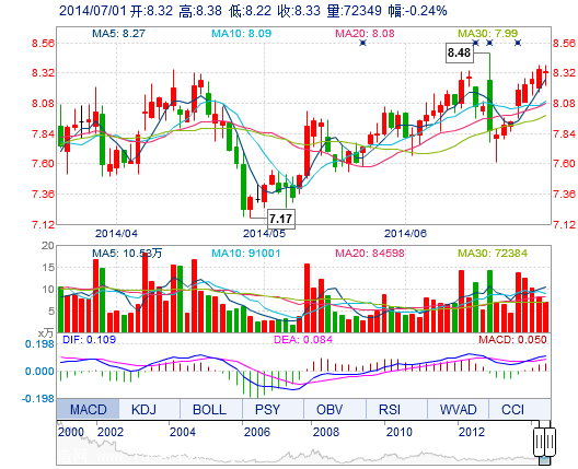 今開: 8.32 成交量: 7.23萬手 振幅: 1.92% 最高: 8.38 成交額: 5996.34萬元 換手率: 1.66% 最低: 8.22 總市值: 36.39億 市凈率: 2.61 昨收: 8.35 流通市值: ...