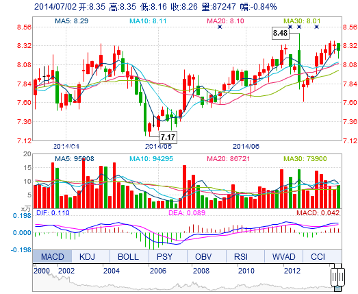 | 今 開(kāi): | 8.35 | 成交量: | 8.72萬(wàn)手 | 振 幅: | 2.28% |