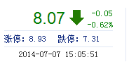 今開: 8.07 成交量: 3.60萬手 振幅: 1.60% 最高: 8.12 成交額: 2895.16萬元 換手率: 1.31% 最低: 7.99 總市值: 23.00億 市凈率: 3.58 昨收: 8.12 流通市值: ...