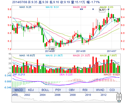 今開(kāi): 9.35 成交量: 15.11萬(wàn)手 振幅: 2.46% 最高: 9.39 成交額: 1.40億元 換手率: 1.70% 最低: 9.16 總市值: 81.89億 市凈率: 3.06 昨收: 9.35 流通市值: 81...