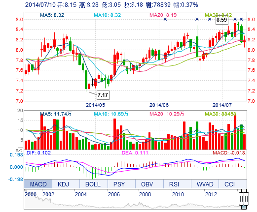 | 今 開(kāi): | 8.15 | 成交量: | 7.88萬(wàn)手 | 振 幅: | 2.82% |