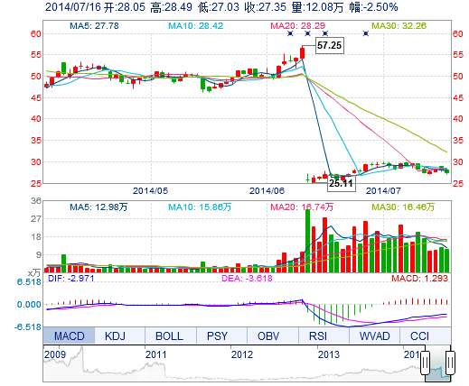 | 今 開: | 28.05 | 成交量: | 12.08萬手 | 振 幅: | 5.20% |