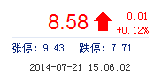 今開: 8.63 成交量: 2.70萬手 振幅: 2.10% 最高: 8.65 成交額: 2307.78萬元 換手率: 0.98% 最低: 8.47 總市值: 24.45億 市凈率: 3.81 昨收: 8.57 流通市值: ...