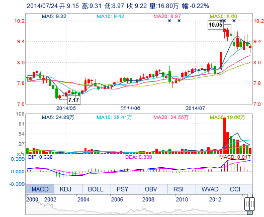 今開: 9.15 成交量: 16.80萬手 振幅: 3.68% 最高: 9.31 成交額: 1.54億元 換手率: 3.85% 最低: 8.97 總市值: 40.27億 市凈率: 2.89 昨收: 9.24 流通市值: 40...