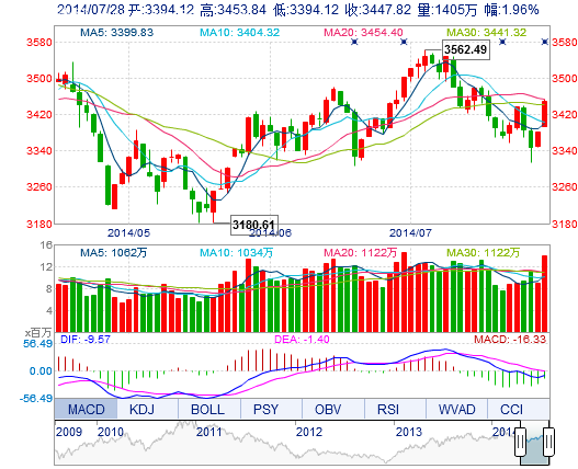 今開(kāi): 3394.12 最高: 3453.84 昨收: 3381.63 最低: 3394.12 成交量: 1404.74萬(wàn)手 振幅: 1.77% 成交額: 196.12億元
