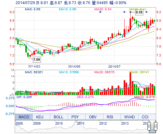 今開(kāi): 8.81 成交量: 6.45萬(wàn)手 振幅: 1.58% 最高: 8.87 成交額: 5675.46萬(wàn)元 換手率: 2.35% 最低: 8.73 總市值: 24.97億 市凈率: 3.89 昨收: 8.84 流通市值: ...
