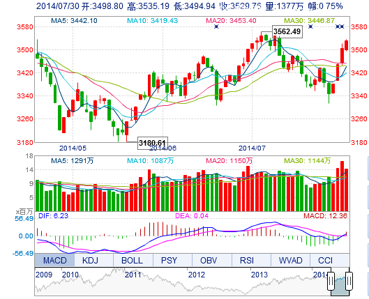 今開: 3498.80 最高: 3535.19 昨收: 3503.55 最低: 3494.94 成交量: 1376.55萬手 振幅: 1.15% 成交額: 217.35億元