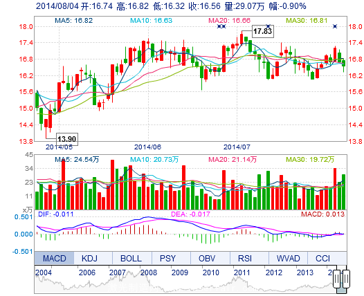 今開: 16.74 成交量: 29.07萬手 振幅: 2.99% 最高: 16.82 成交額: 4.78億元 換手率: 3.04% 最低: 16.32 總市值: 174.80億 市凈率: 4.74 昨收: 16.71 流通市值...