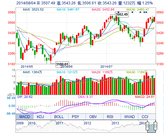 今開(kāi): 3507.49 最高: 3543.26 昨收: 3499.57 最低: 3506.61 成交量: 1232.36萬(wàn)手 振幅: 1.05% 成交額: 186.24億元