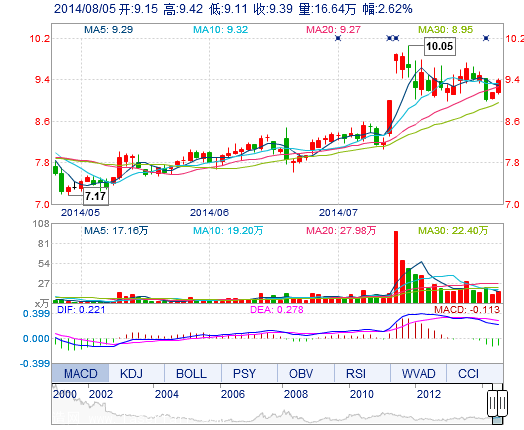 今開(kāi): 9.15 成交量: 16.64萬(wàn)手 振幅: 3.39% 最高: 9.42 成交額: 1.55億元 換手率: 3.81% 最低: 9.11 總市值: 41.02億 市凈率: 2.94 昨收: 9.15 流通市值: 41...