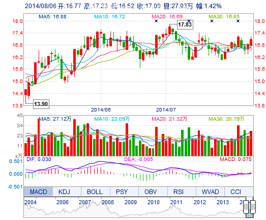 今開: 16.77 成交量: 27.93萬(wàn)手 振幅: 4.21% 最高: 17.23 成交額: 4.73億元 換手率: 2.92% 最低: 16.52 總市值: 180.40億 市凈率: 4.89 昨收: 16.85 流通市值...